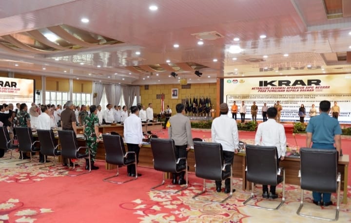 Deklarasi Netralitas ASN diikuti oleh ASN se- Sumut. Turut hadir pada kesempatan tersebut Pangdam I/Bukit Barisan Mochamad Hasan, Kajati Sumut Idianto dan Kepala OPD se-Pemprov Sumut. (Rizky Zulianda)